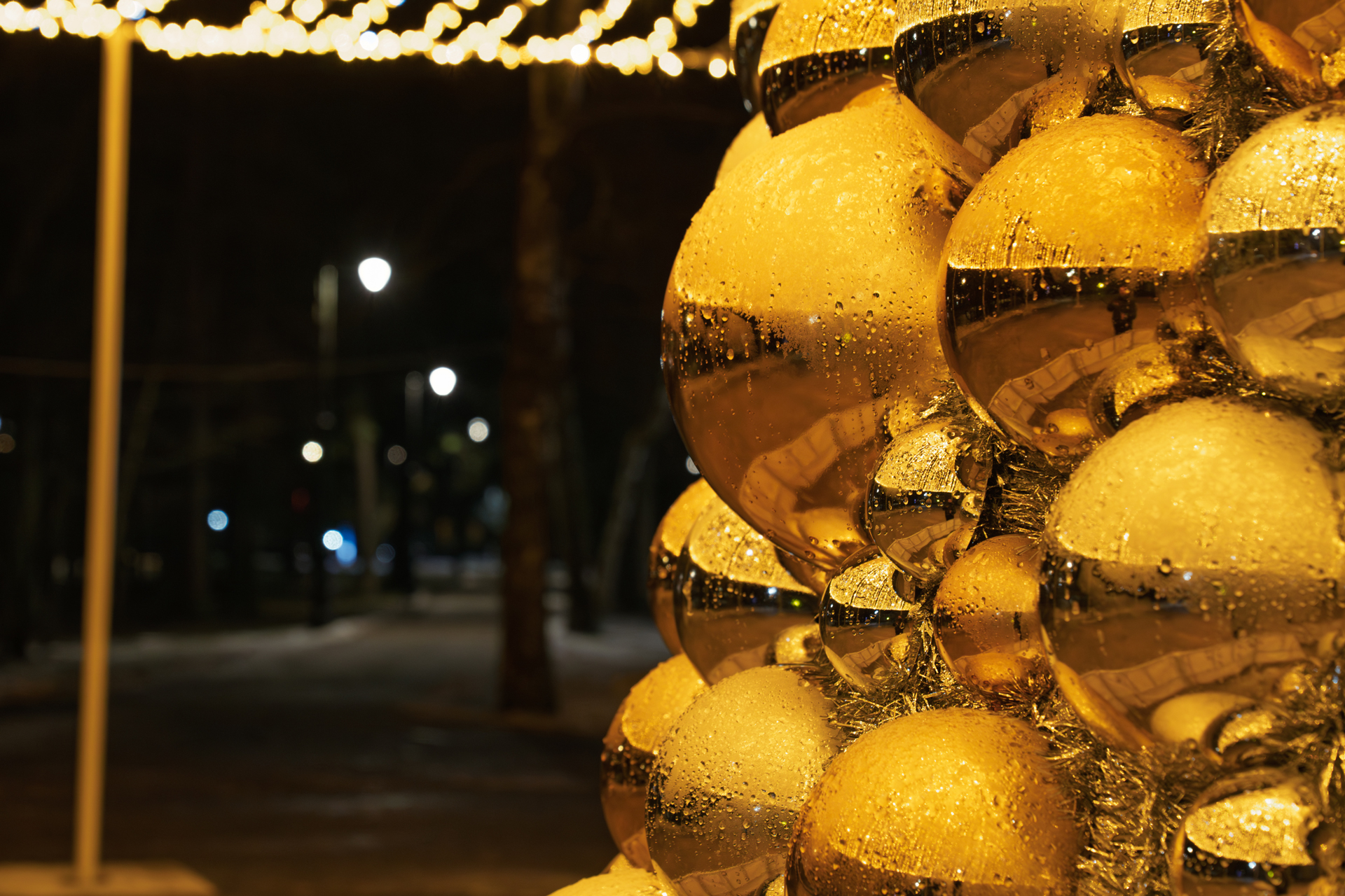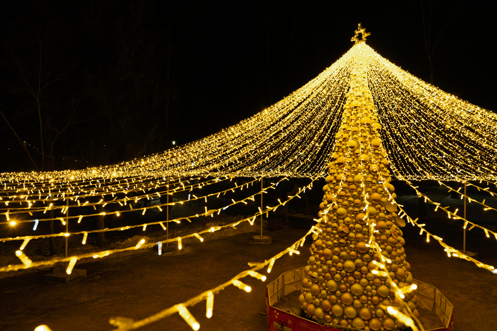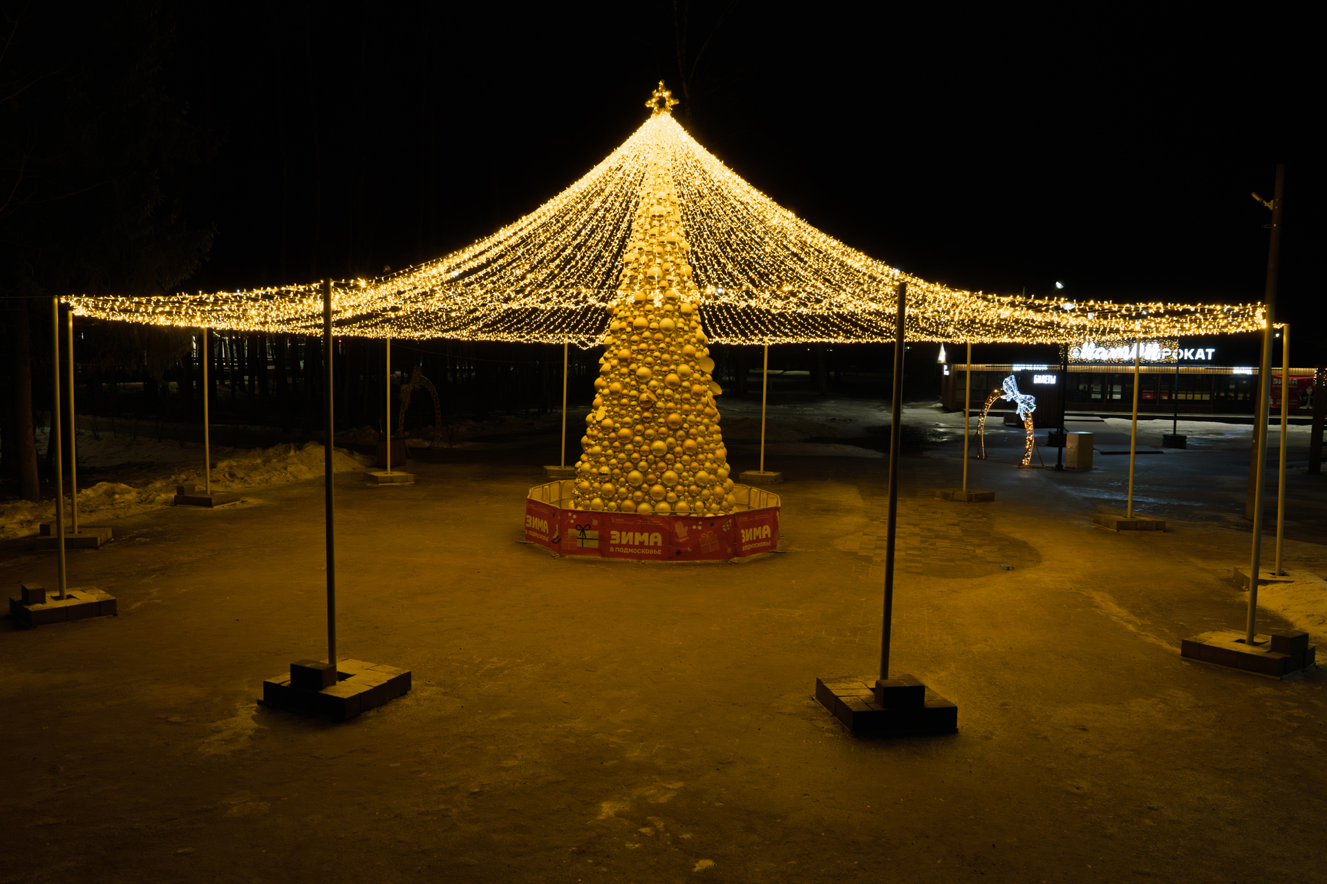 Оформление площади светодиодным шатром. Изготовление и монтаж ели из пластиковых шаров.
