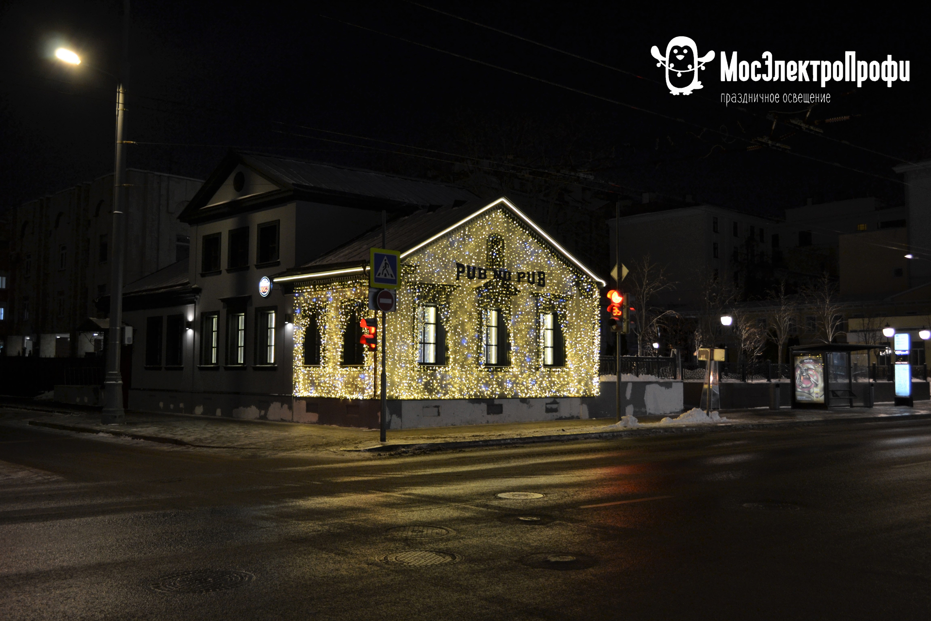 Таганская площадь, 86.1 с. 1. Оформление фасада светодиодным занавесом. Оформление контура крыши гибким светодиодным неоном.