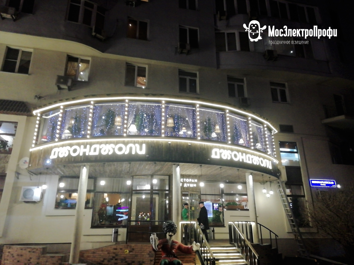 Оформление верхнего и нижнего контура окон гибким светодиодным неоном. Оформление вертикальных стоек окон светодиодной гирляндой Белт Лайт.